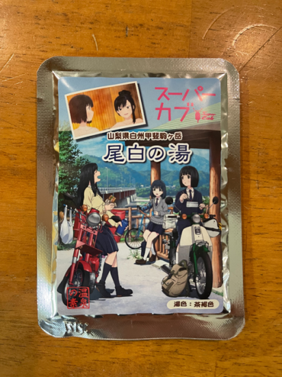 ここ北杜市が舞台のアニメスーパーカブに登場するみんなの地元山梨県北杜市の名湯「尾白の湯(おじらのゆ)」の温泉の元が発売されました!